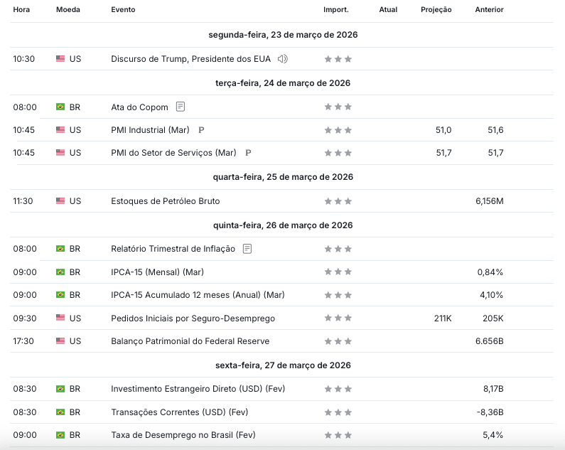 - Inflação: Atenção total à Ata do Copom (Terça) e ao IPCA-15 (Quinta).
